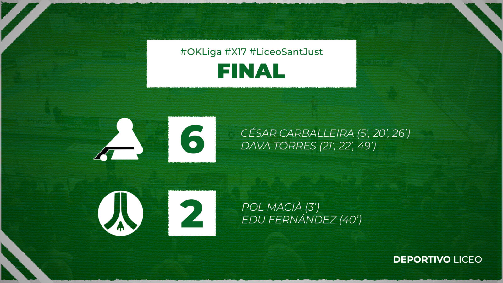 El Deportivo Liceo de Juan Copa venció con contundencia al Sant Just y logró su segundo triunfo consecutivo. Enlaza así dos semanas seguidas sumando de tres, algo que no ocurría desde el mes de noviembre y que permite a los verdiblancos auparse a la zona alta de la clasificación.